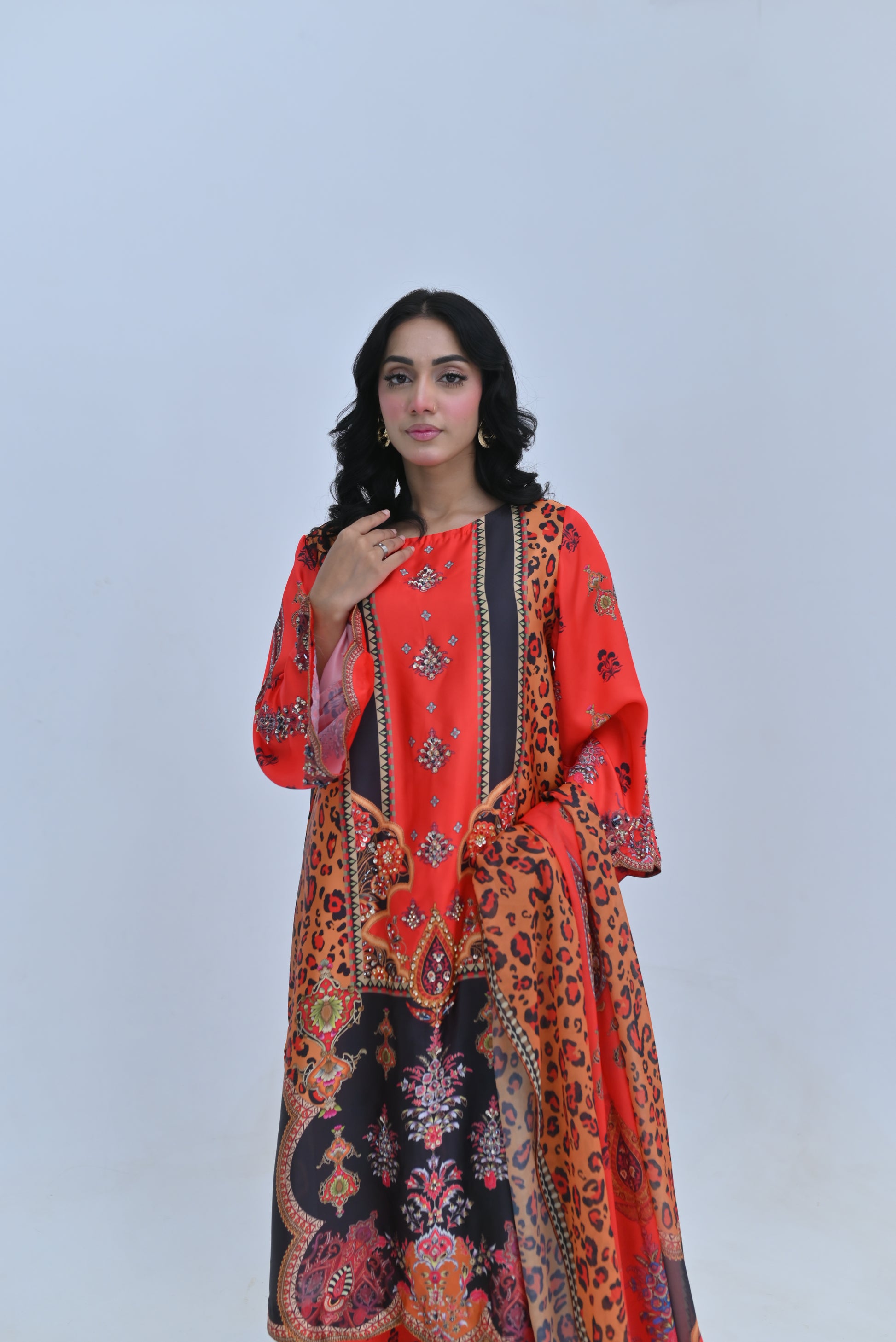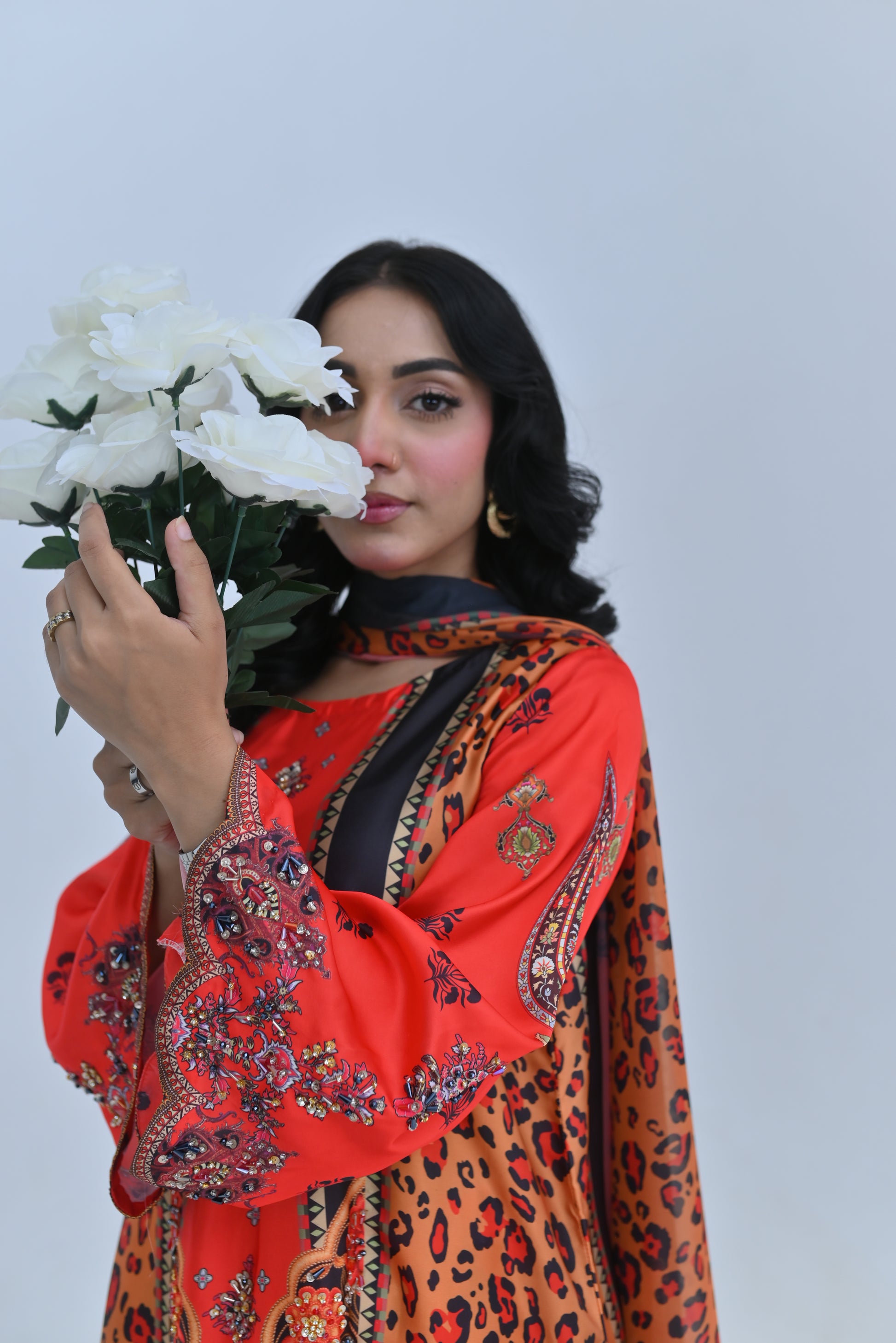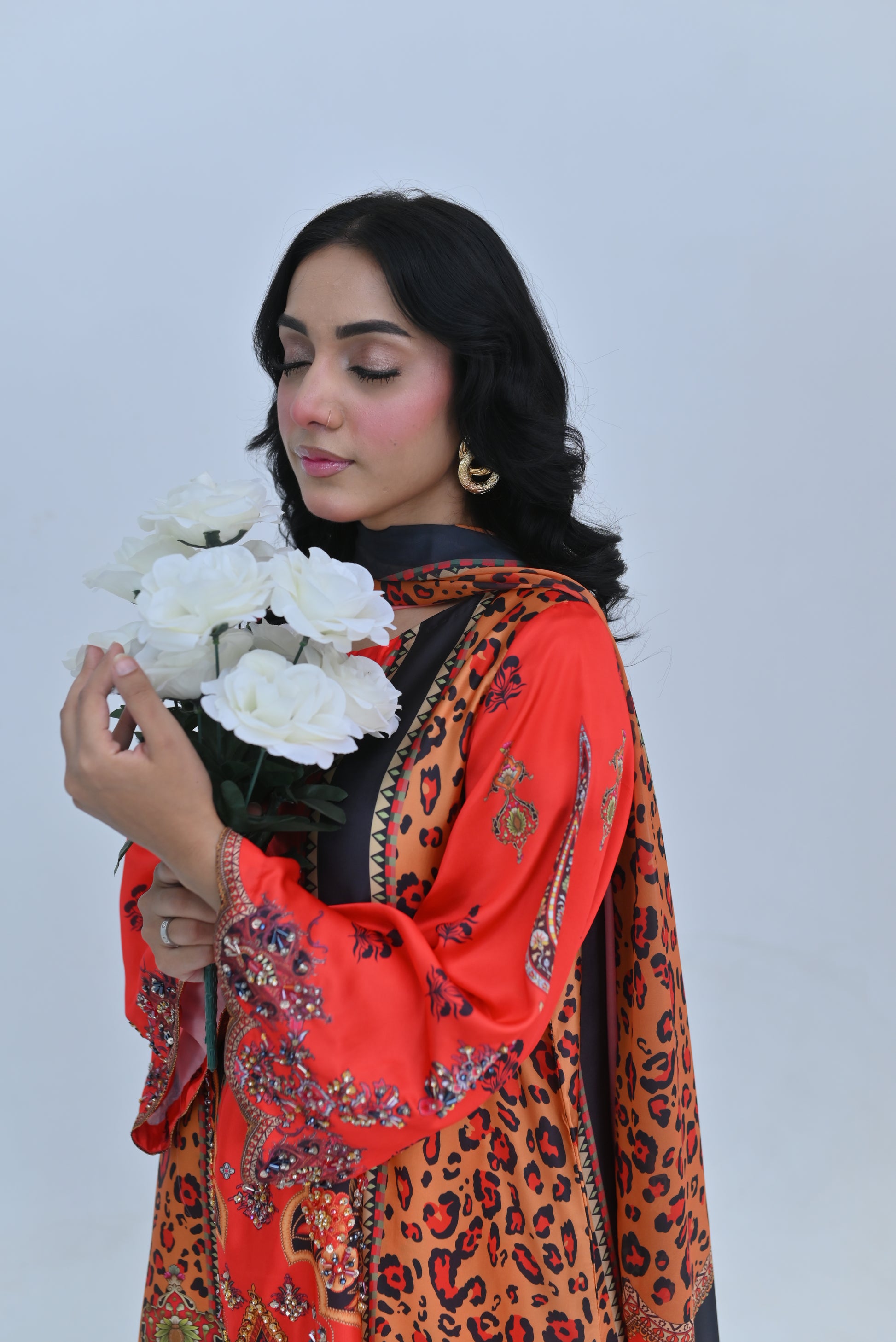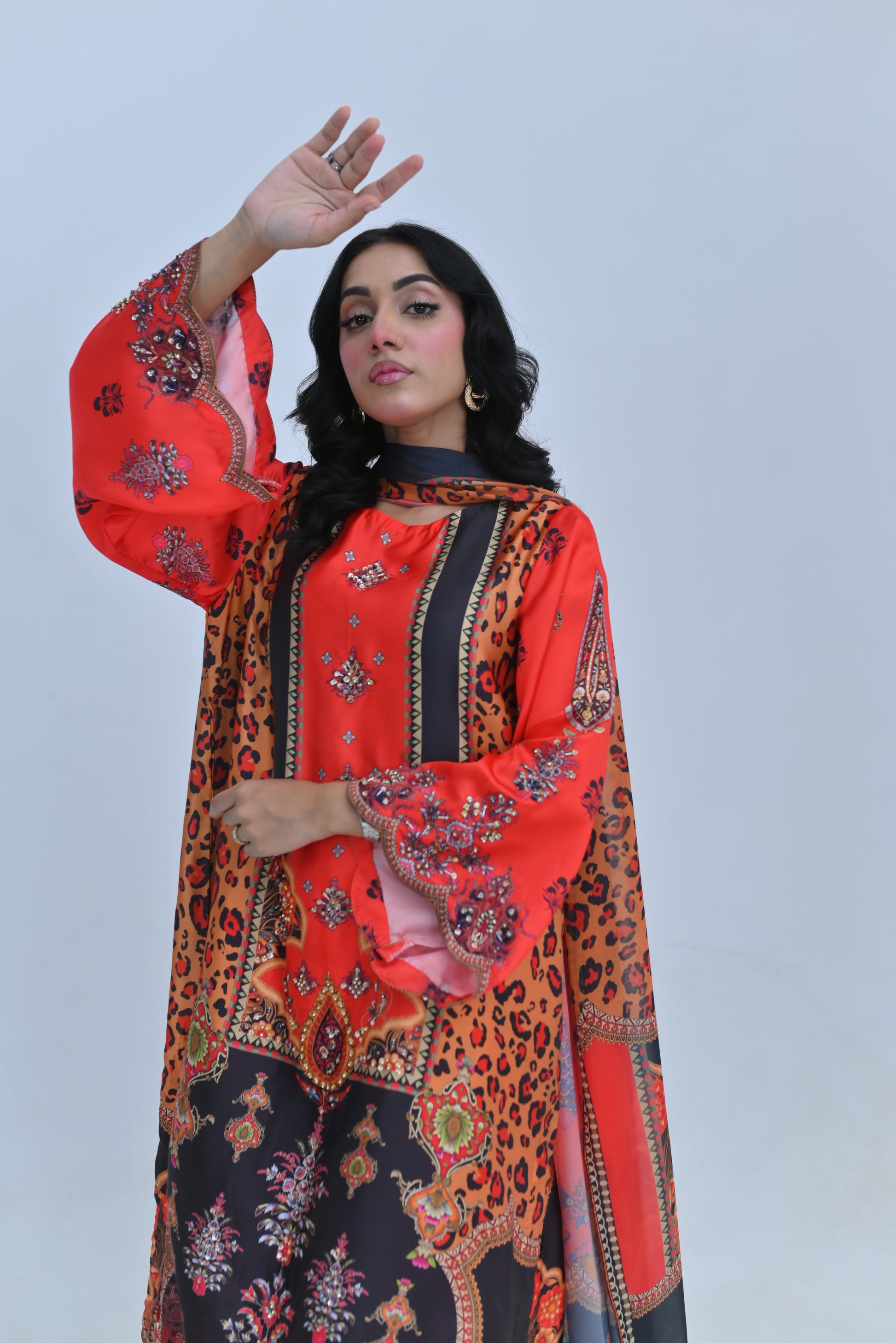 Aatish Charmeuse design from the HEER Collection by ARTSAY. This striking three-piece silk ensemble is crafted from premium Charmeuse Silk for the shirt and trouser, featuring a bold, vibrant print with printed apple silk dupatta. The look is perfected with intricate hand-embellishment on the neck and sleeves, offering a bespoke sparkle.