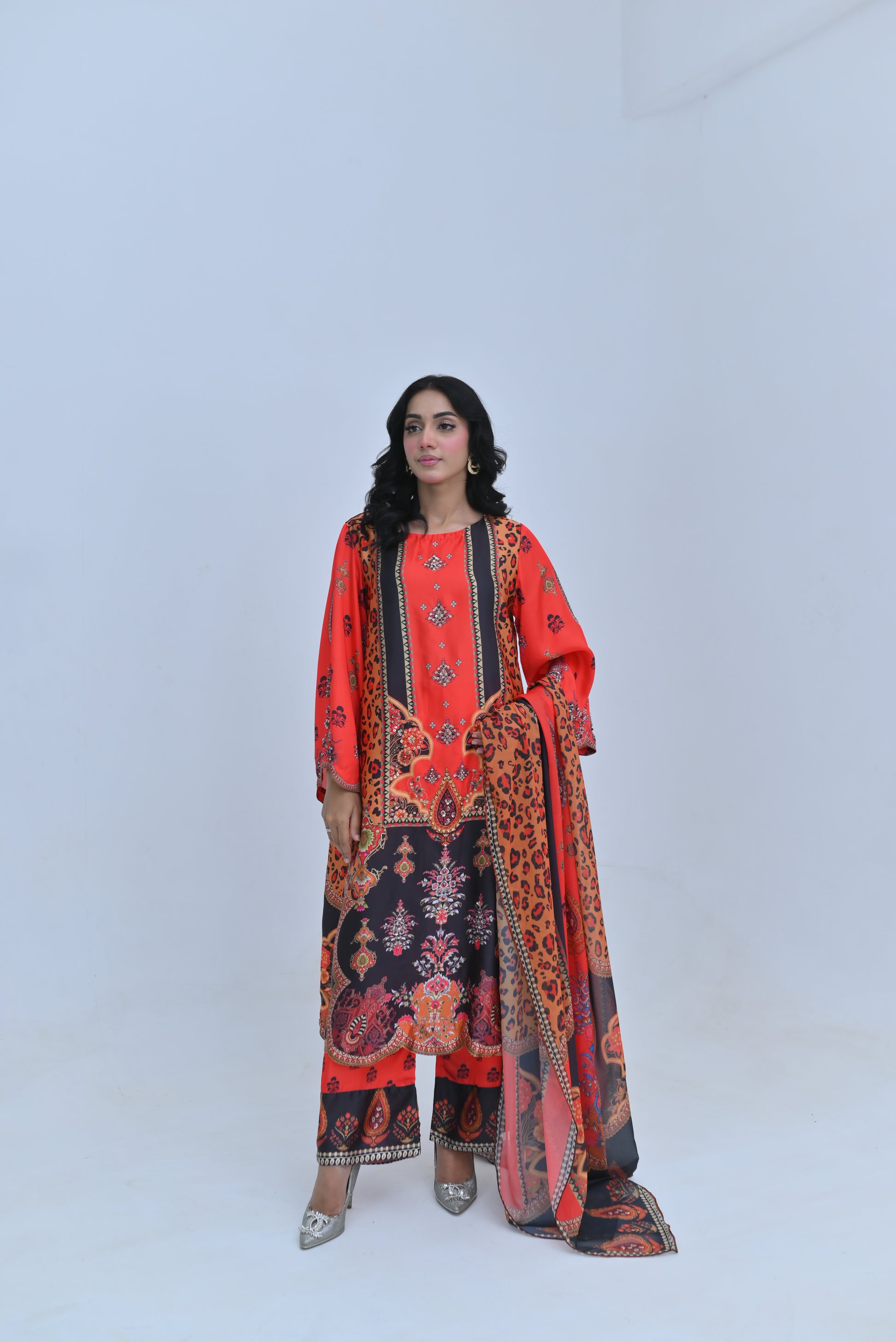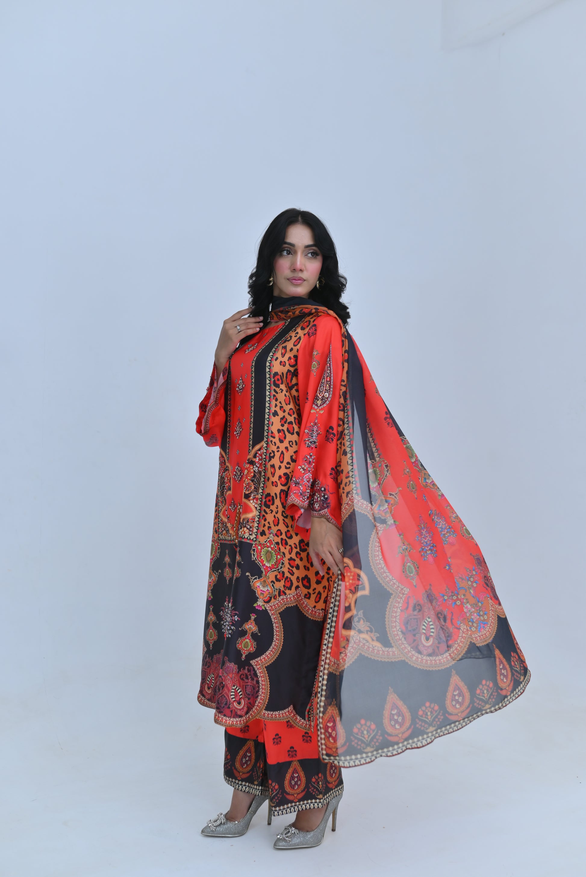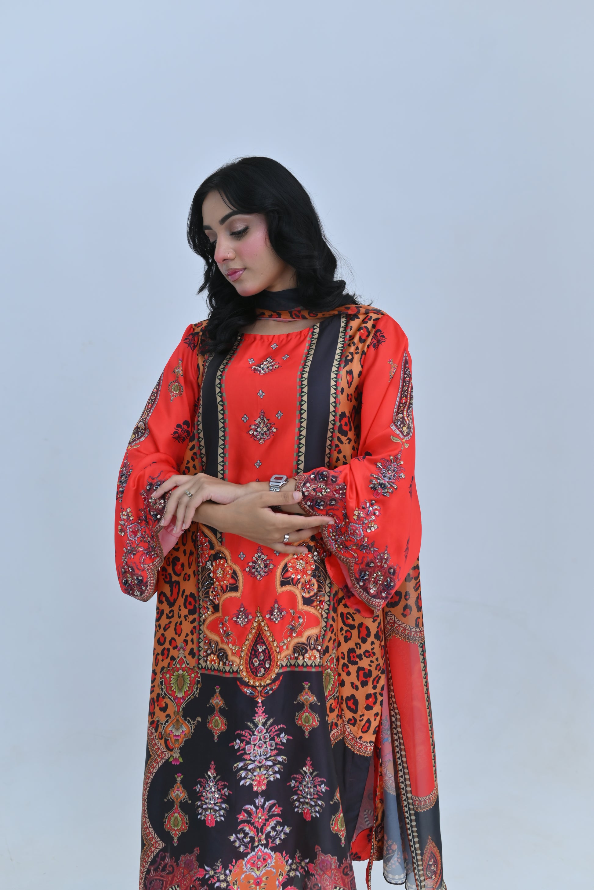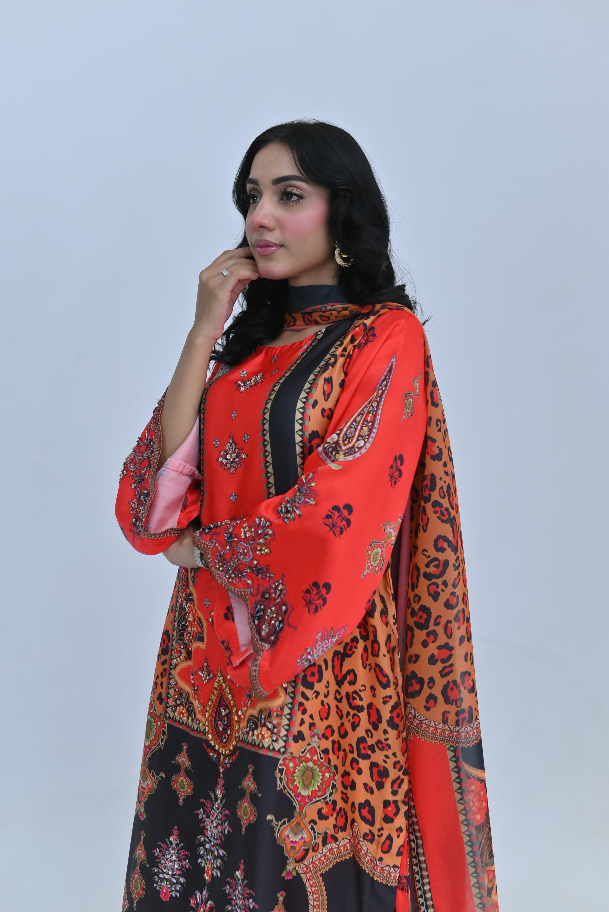 Aatish Charmeuse design from the HEER Collection by ARTSAY. This striking three-piece silk ensemble is crafted from premium Charmeuse Silk for the shirt and trouser, featuring a bold, vibrant print with printed apple silk dupatta. The look is perfected with intricate hand-embellishment on the neck and sleeves, offering a bespoke sparkle.
