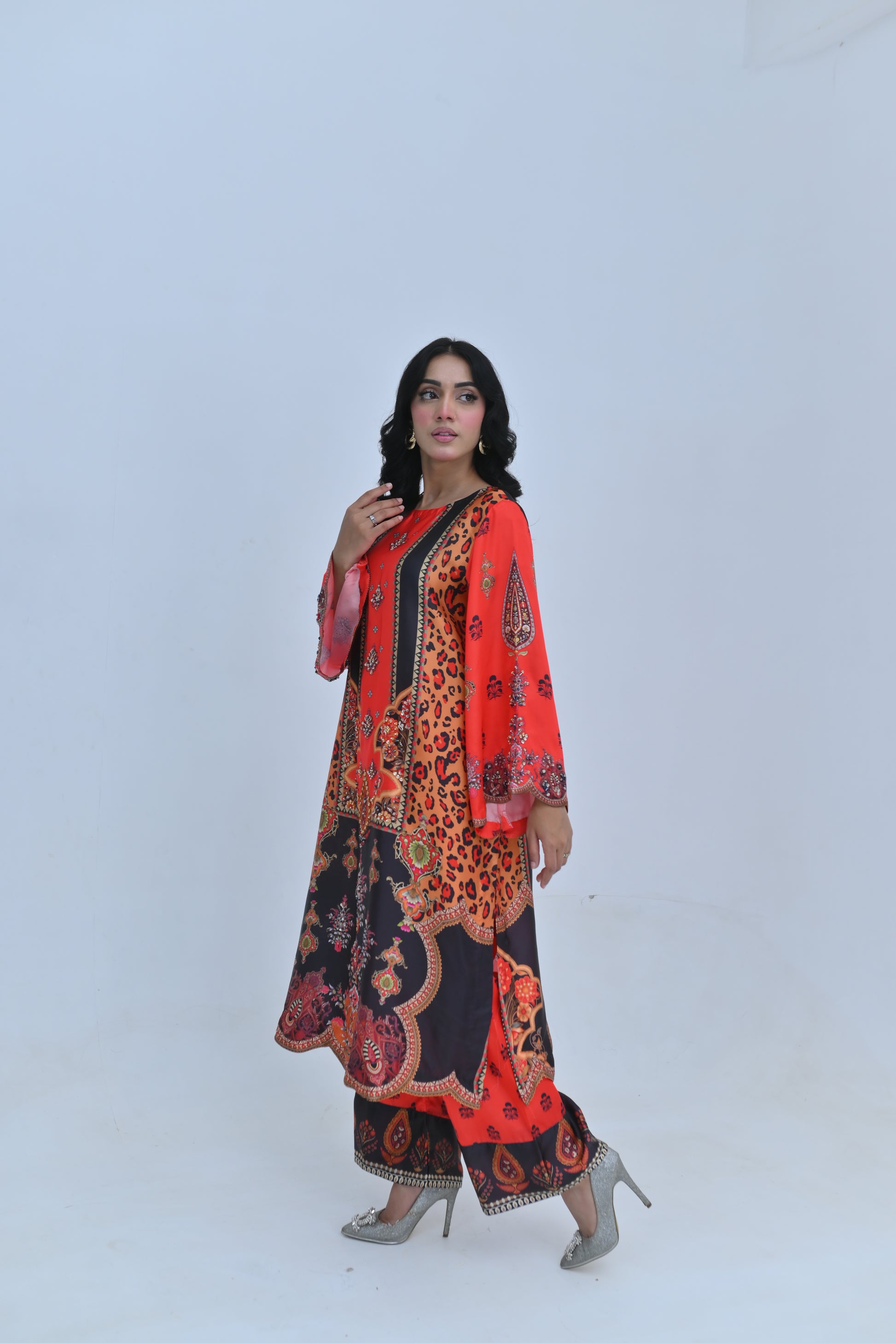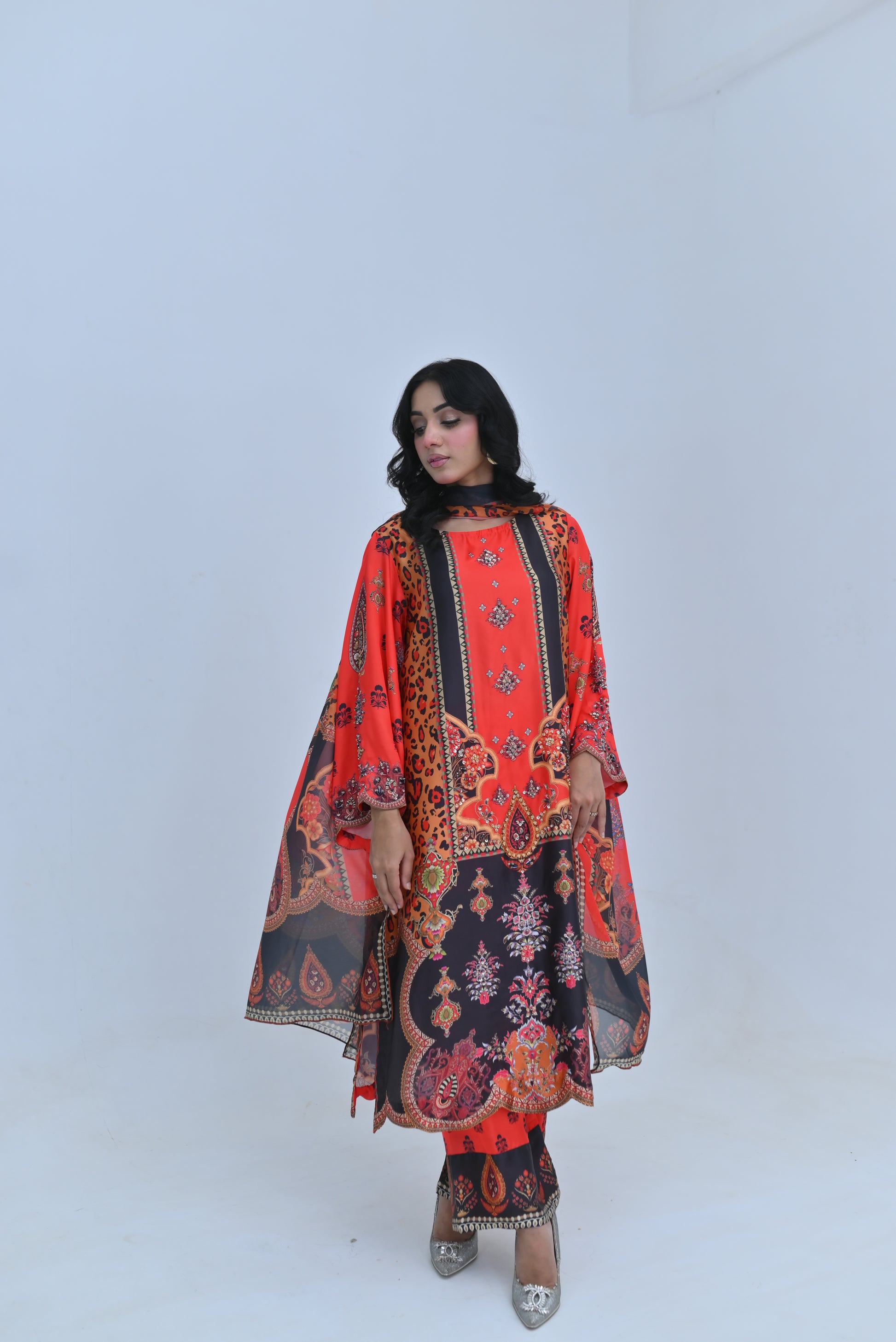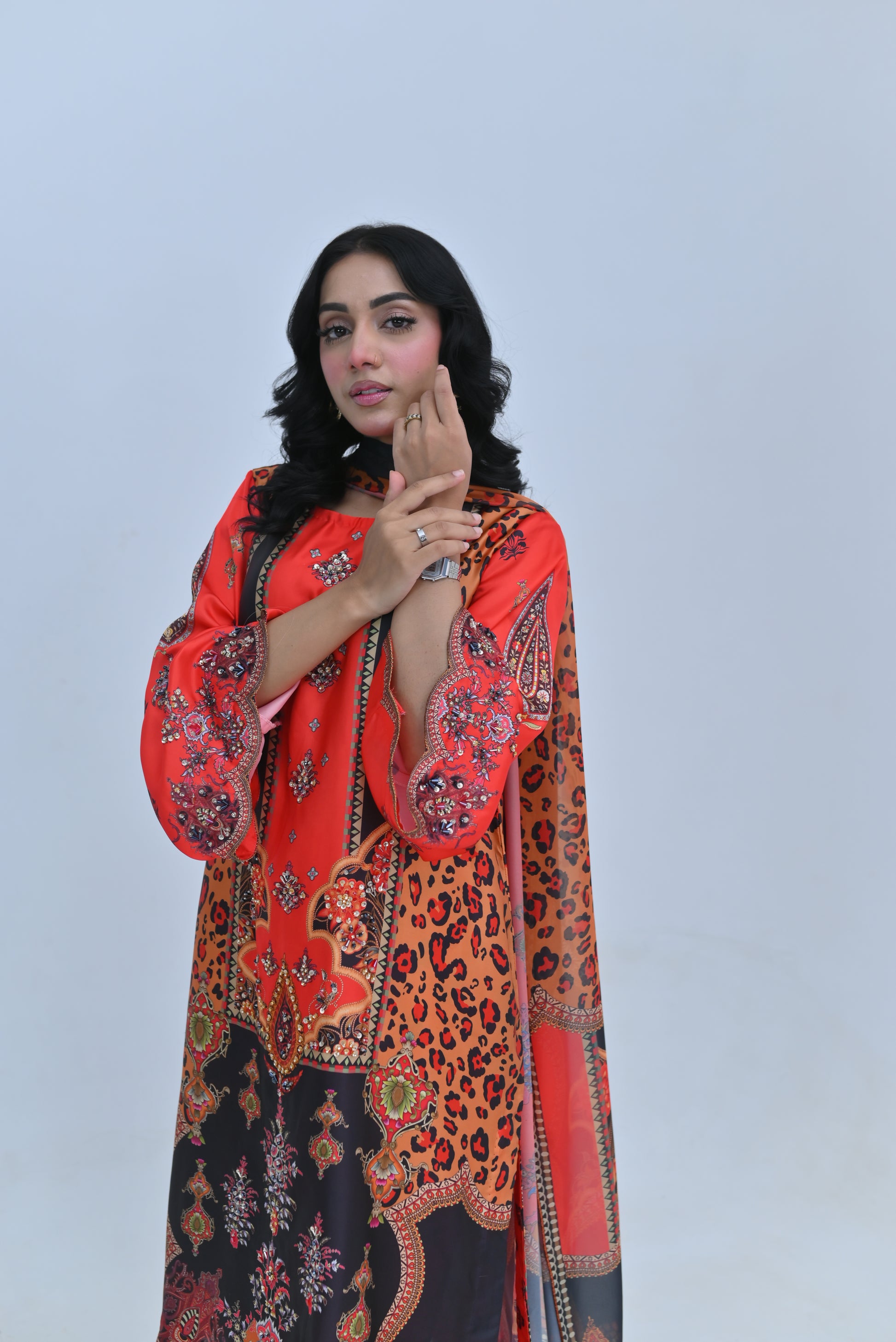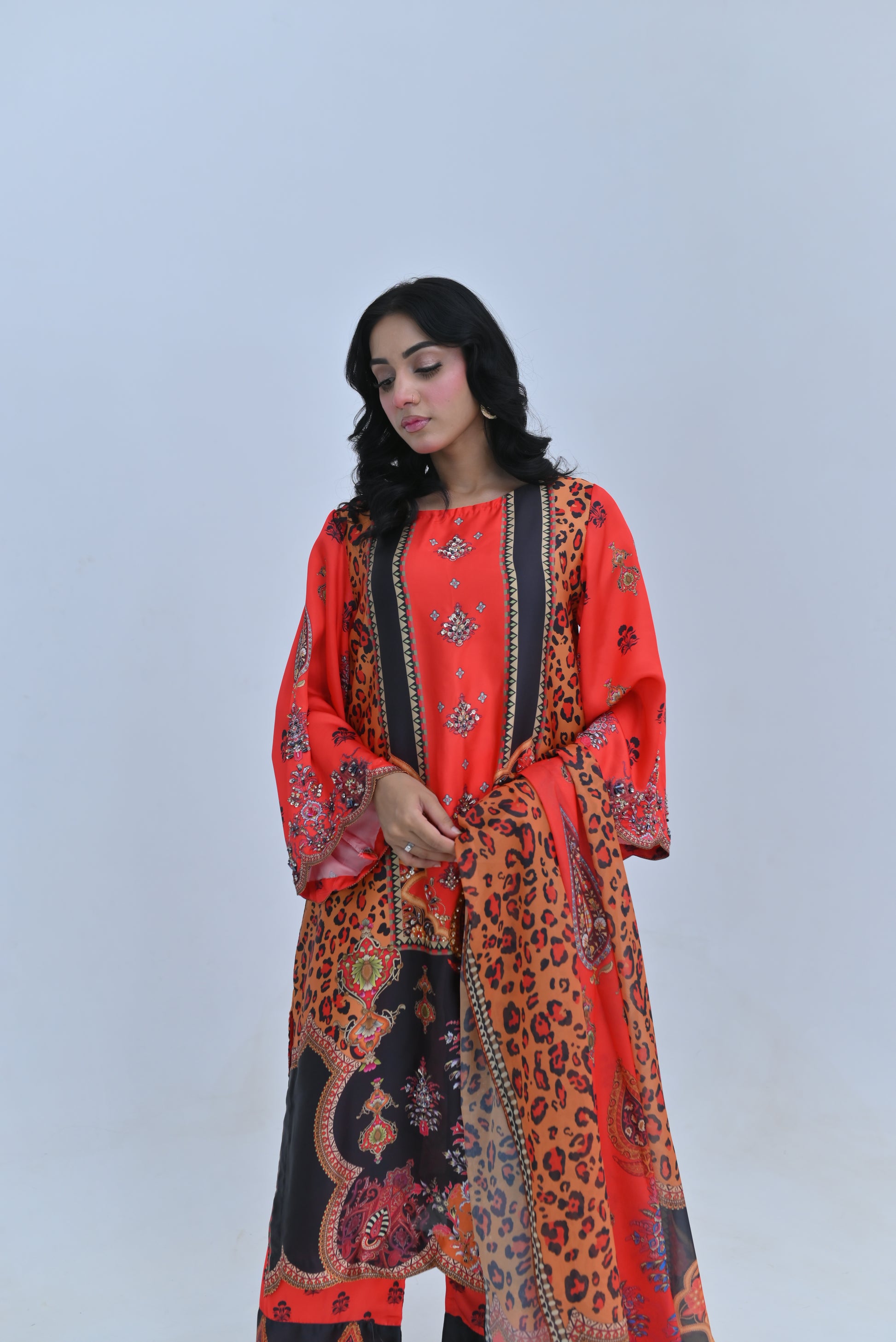 Aatish Charmeuse design from the HEER Collection by ARTSAY. This striking three-piece silk ensemble is crafted from premium Charmeuse Silk for the shirt and trouser, featuring a bold, vibrant print with printed apple silk dupatta. The look is perfected with intricate hand-embellishment on the neck and sleeves, offering a bespoke sparkle.