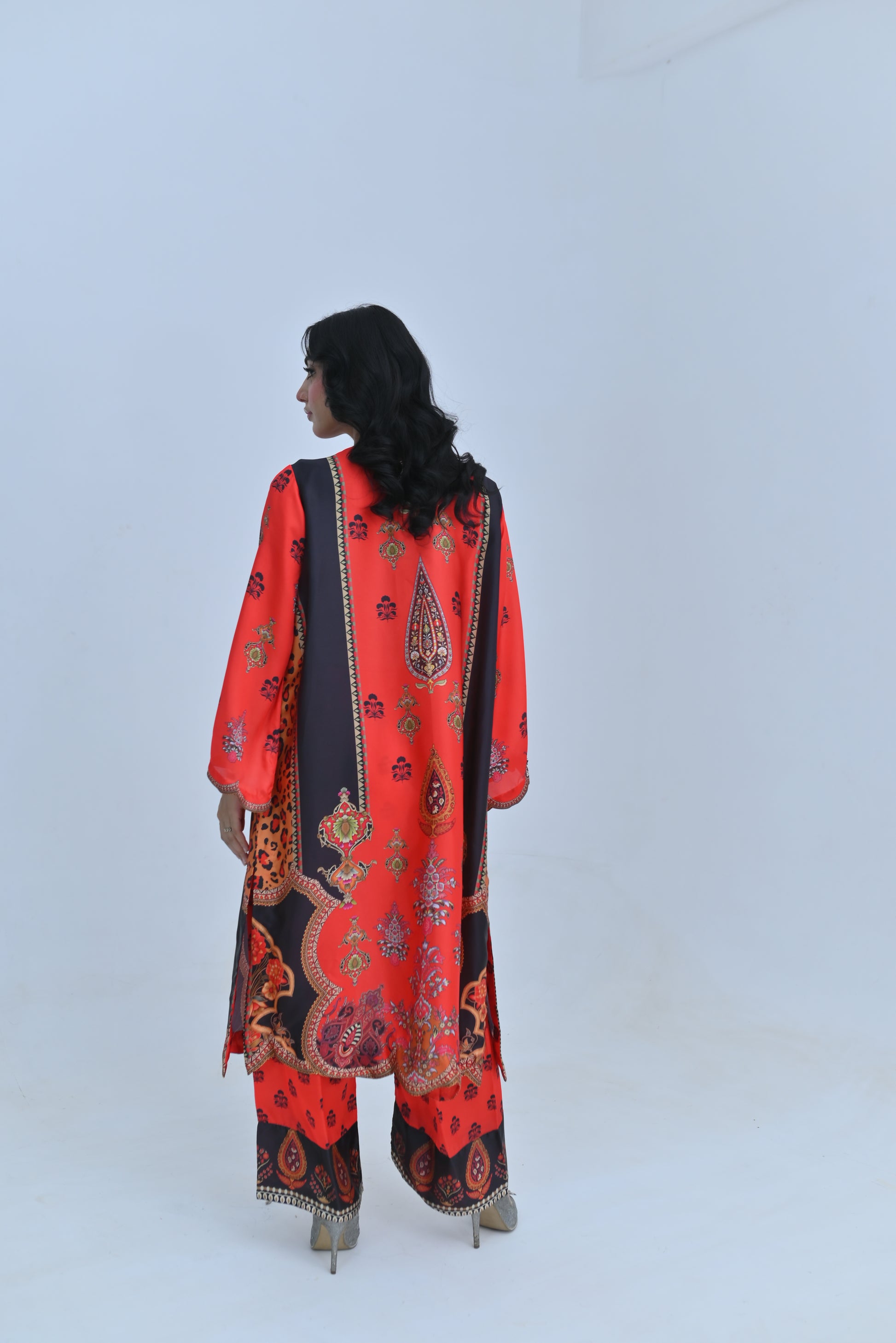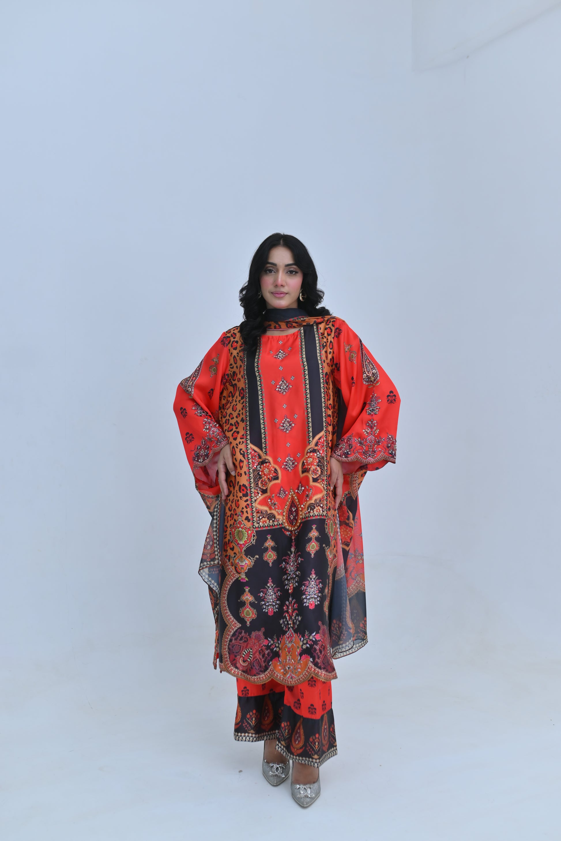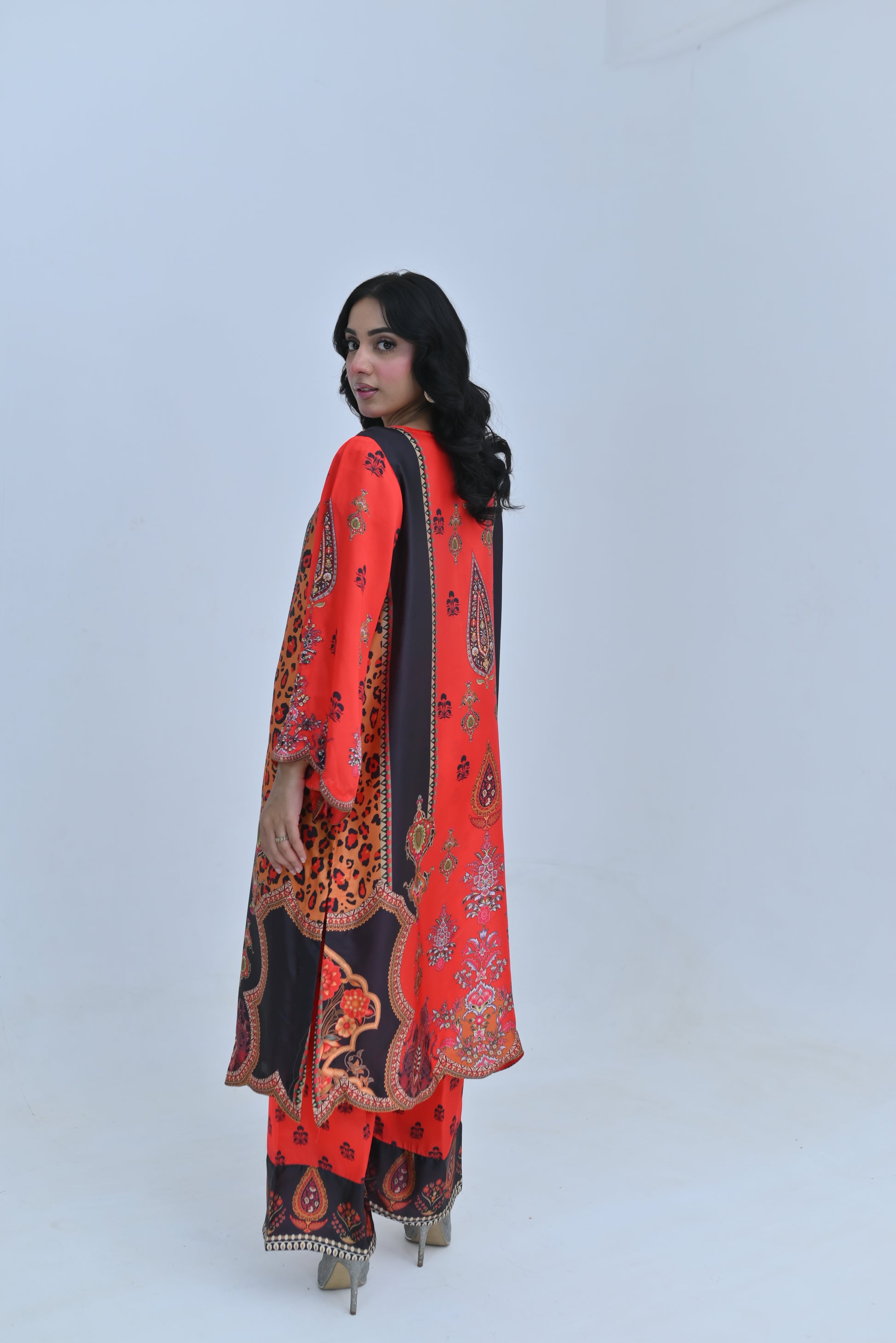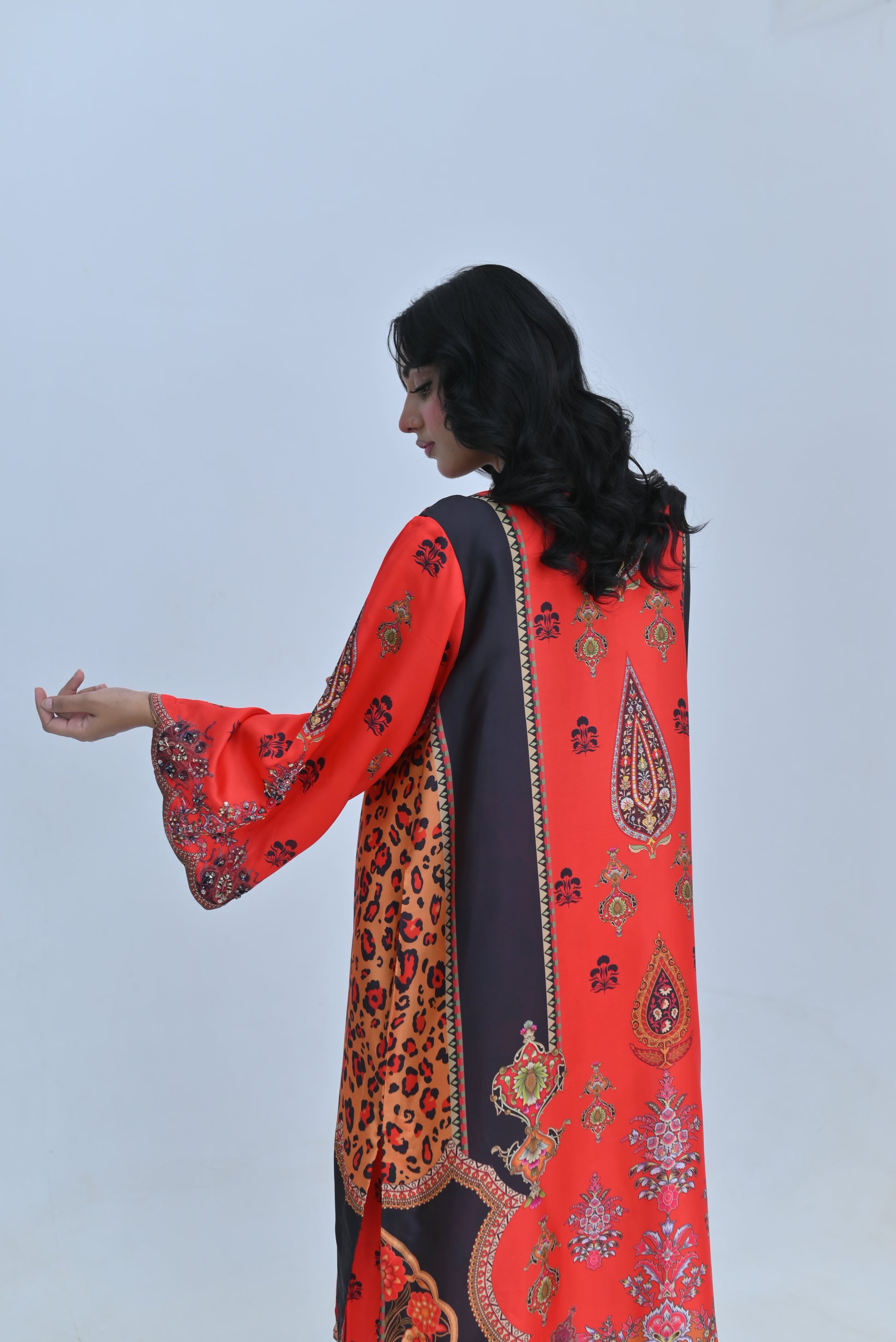 Aatish Charmeuse design from the HEER Collection by ARTSAY. This striking three-piece silk ensemble is crafted from premium Charmeuse Silk for the shirt and trouser, featuring a bold, vibrant print with printed apple silk dupatta. The look is perfected with intricate hand-embellishment on the neck and sleeves, offering a bespoke sparkle.