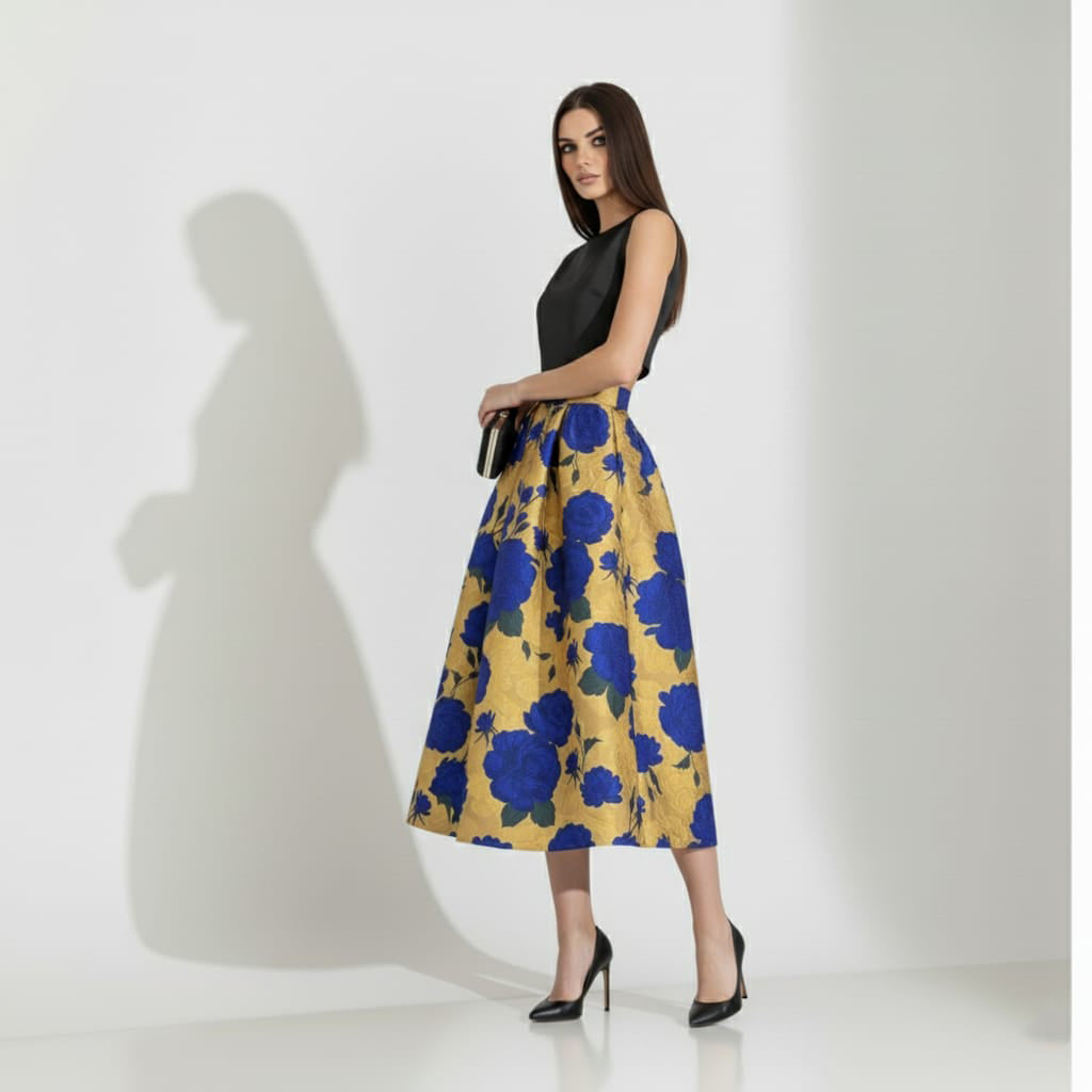 Unleash your inner style icon with this breathtaking Gold-Blue Floral Co-ord Set. This ensemble is carefully balanced, featuring a minimalist silk top to anchor the drama of a voluminous, art-inspired skirt. Perfect for making a bold, unforgettable statement at any special event.
