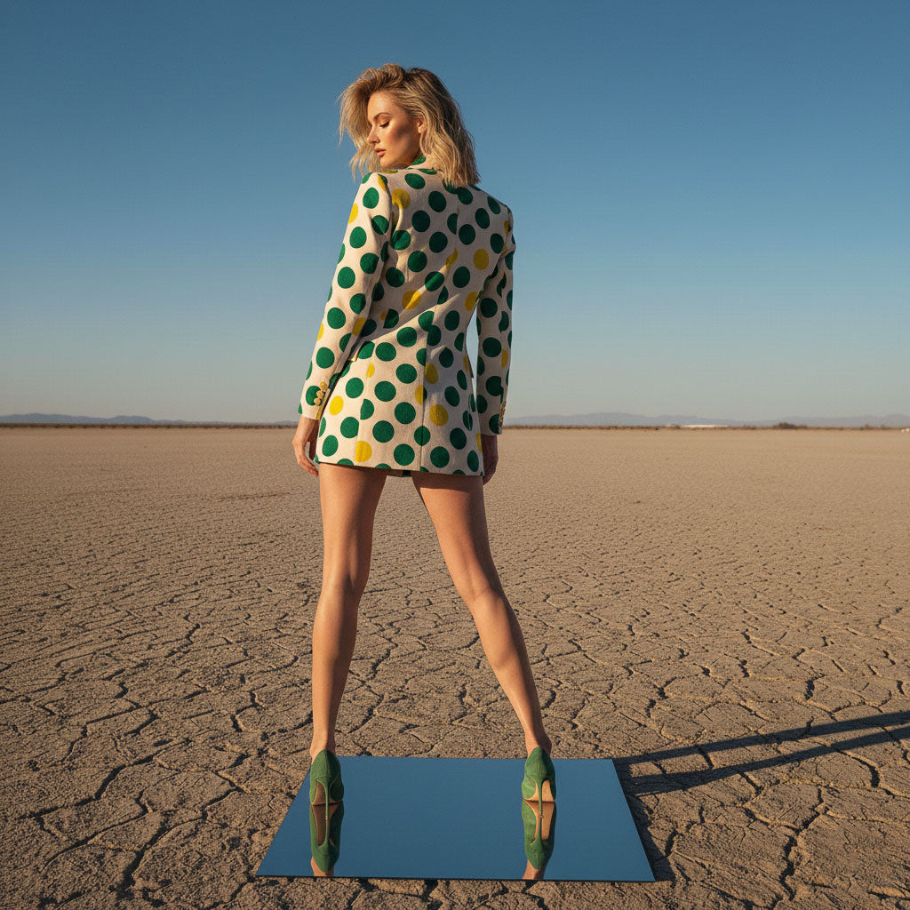 Step out in high-fashion luxury with our Velvet Polka Dot Blazer Dress. Crafted from premium, plush velvet, this 1-piece masterpiece features a striking green and yellow polka dot motif on a creamy base. Perfect for those who want a structured, powerful silhouette without sacrificing a playful edge.