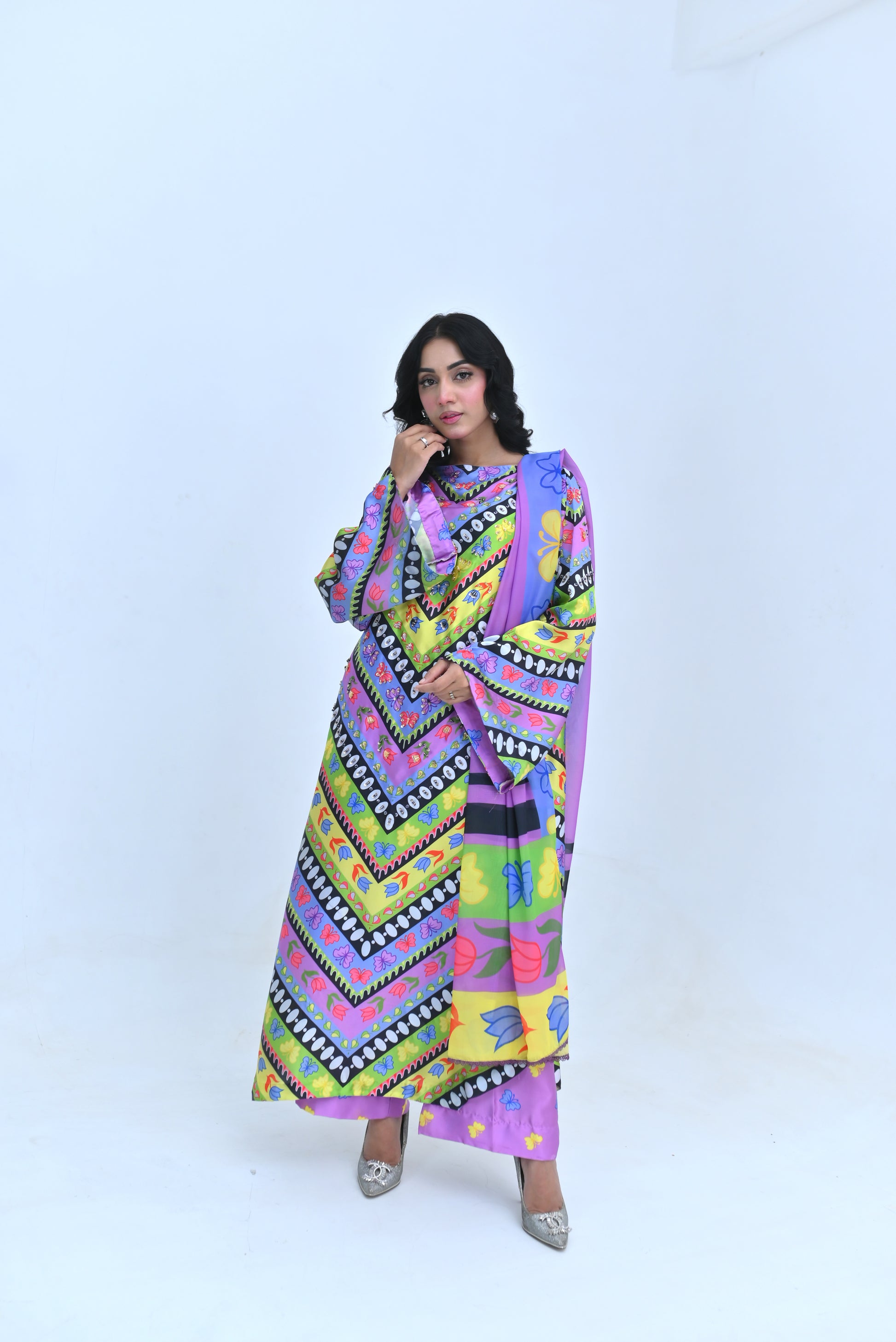 Stand out in this vibrant Charmeuse Silk suit featuring a long shirt with a dynamic multi-color chevron print. Intricate hand embellishment decorates the neckline and sleeves for a touch of luxury. Paired with coordinating trousers and a soft Apple Silk dupatta with a matching border print. Perfect for Pakistani formal wear, festive events, and luxury designer silk suits. Shop now for this stunning, statement-making ensemble!
